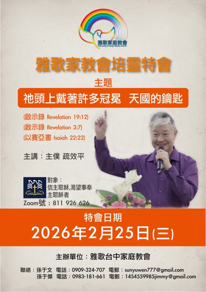 ◆ 聯絡:黃姊妹,0933-900-107,電郵:jmtaiwan@jesusministries.org